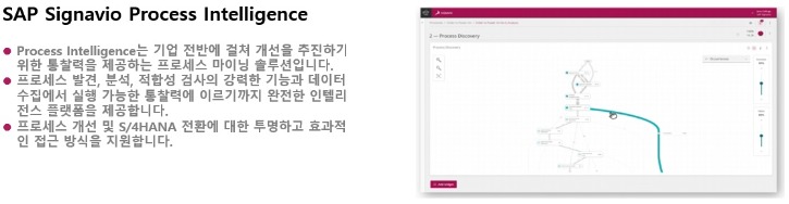 SAP SIGNAVIO는 기업이 모든 비즈니스 프로세스를 신속하게 이해, 개선, 전환 및 관리 할 수 있도록 지원하는 클라우드 기반 프로세스 관리 플랫폼으로 Live Insights를 통해 비즈니스 프로세스를 최적화하고 지능형 비즈니스 혁신을 위한 협업 프로세스 인텔리전스를 제공합니다.